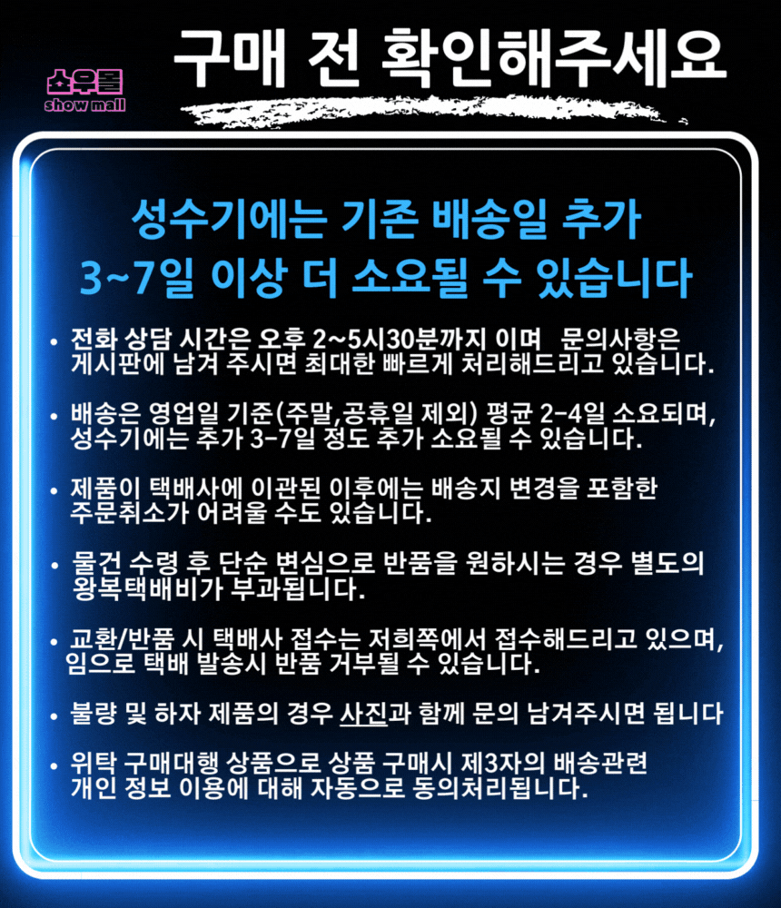 이용약관 개인정보처리방침  |  사업자정보확인 Copyrightⓒ쇼우몰 All rights reserved.