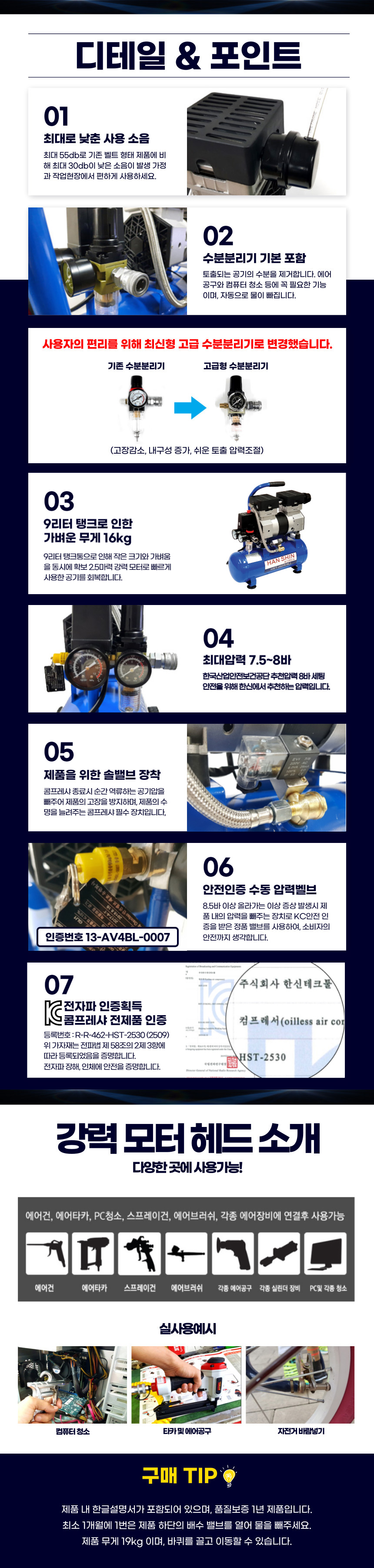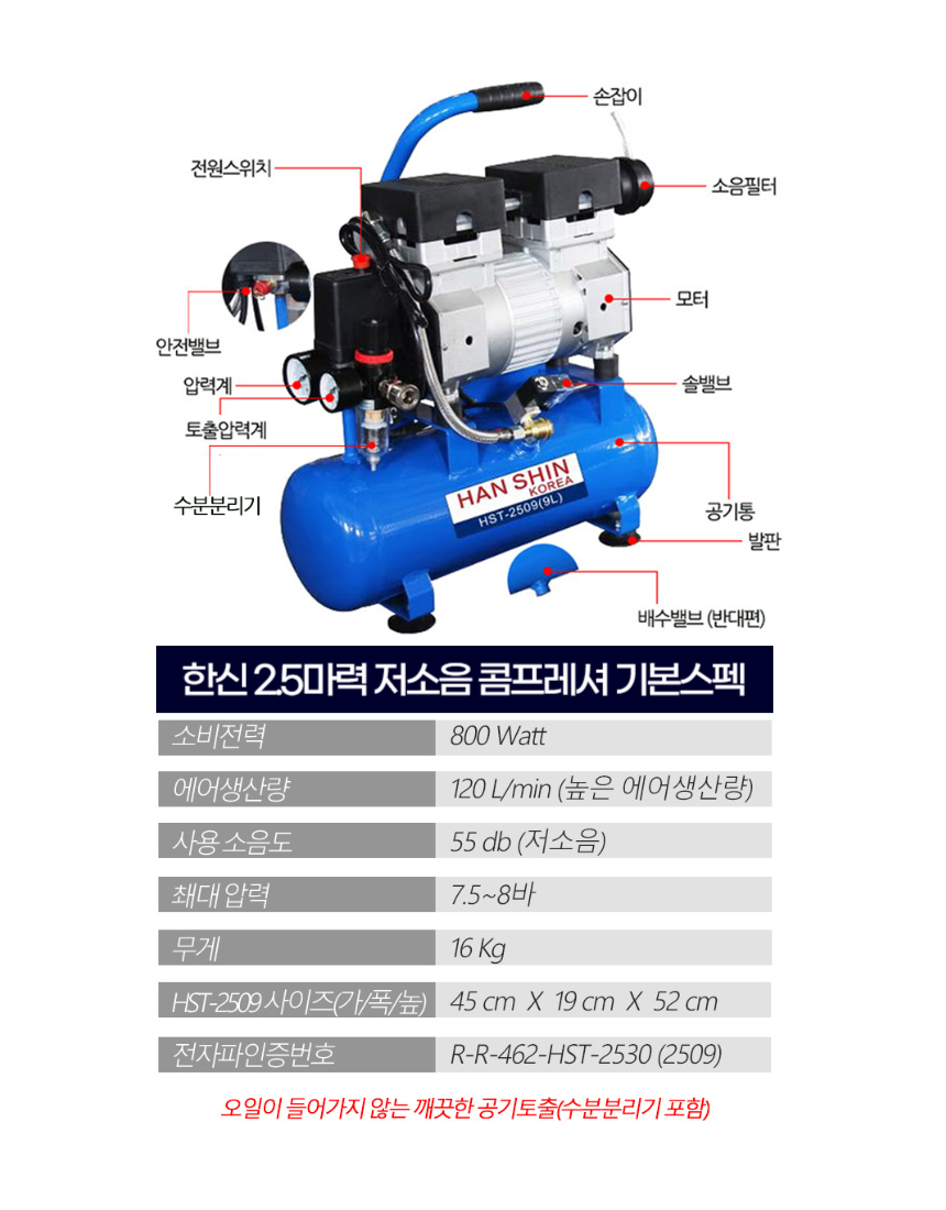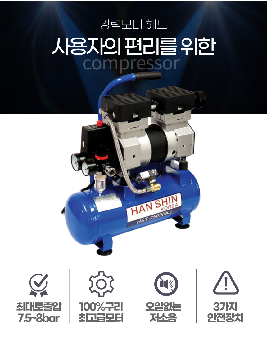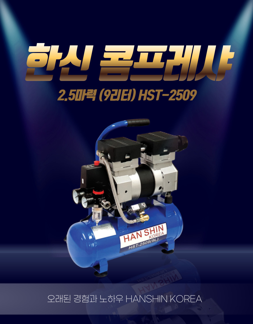 [한신]콤프레샤 2.5마력 9리터 HST-2509 (코일호수+에어건)저소음 공기주입