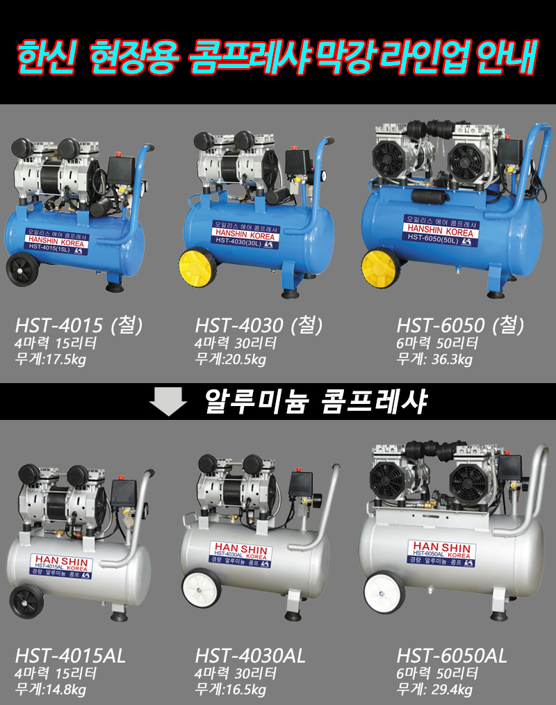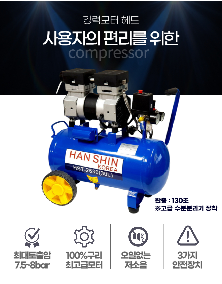 [한신]콤프레샤 2.5마력 30리터 HST-2530 (코일호수+에어건) 저소음 무오일