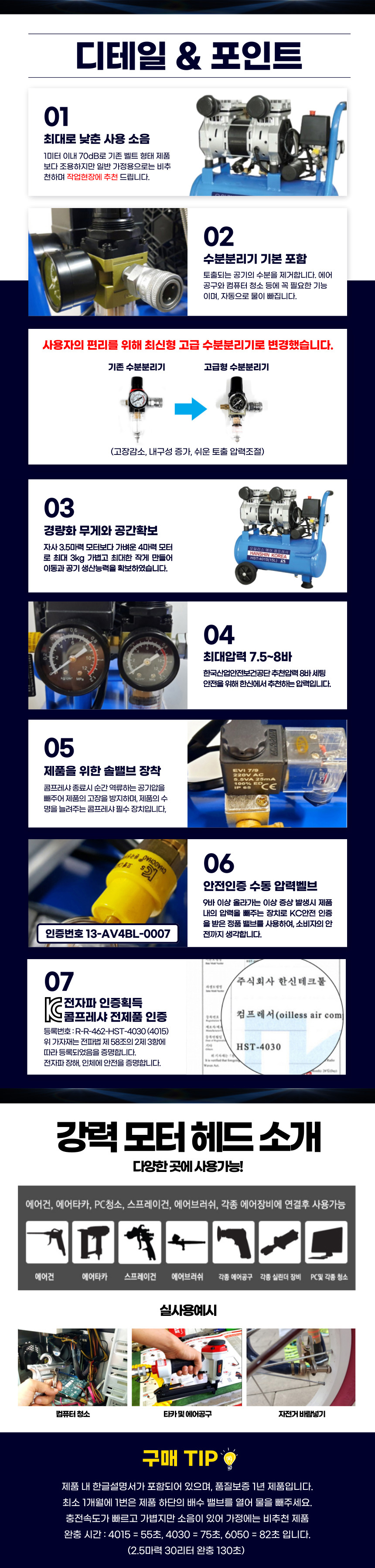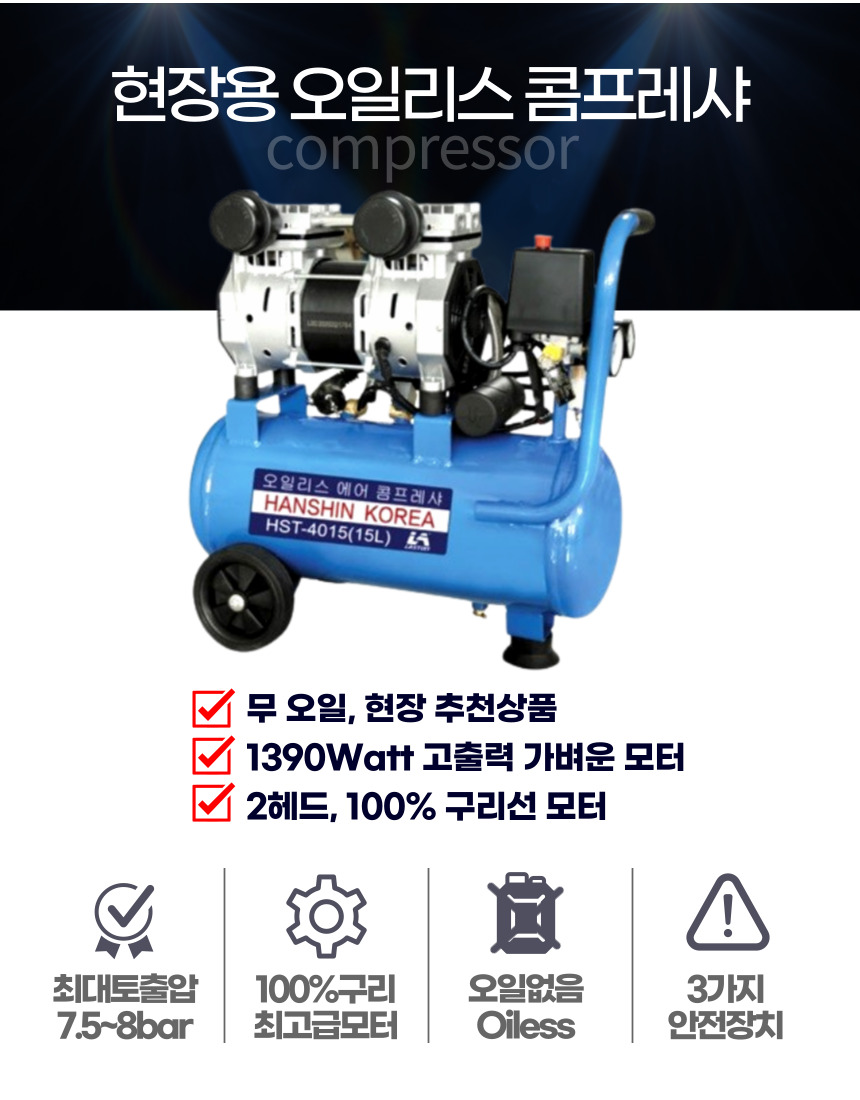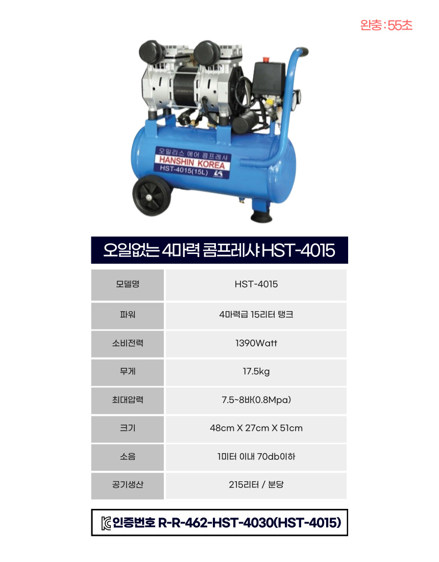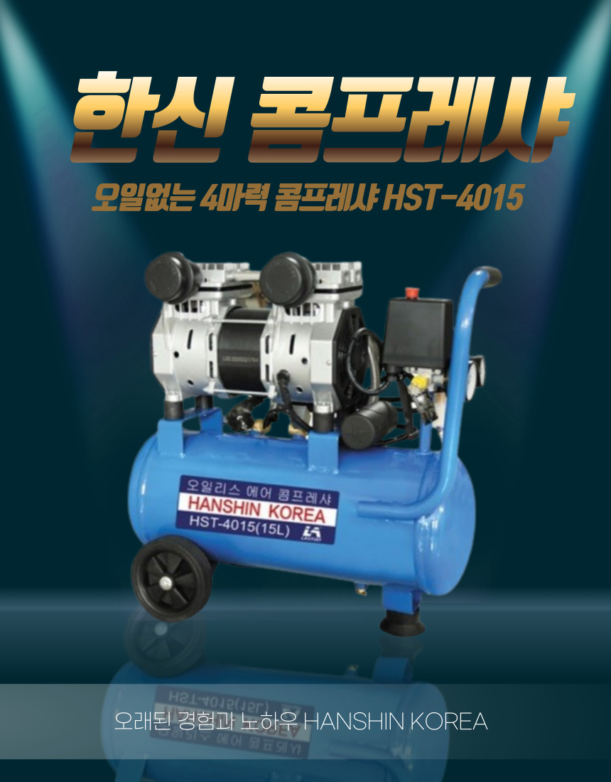[한신]오일없는 콤프레샤 4.0마력 15리터 HST-4015 (코일호스+에어건)