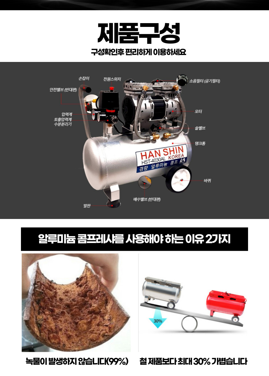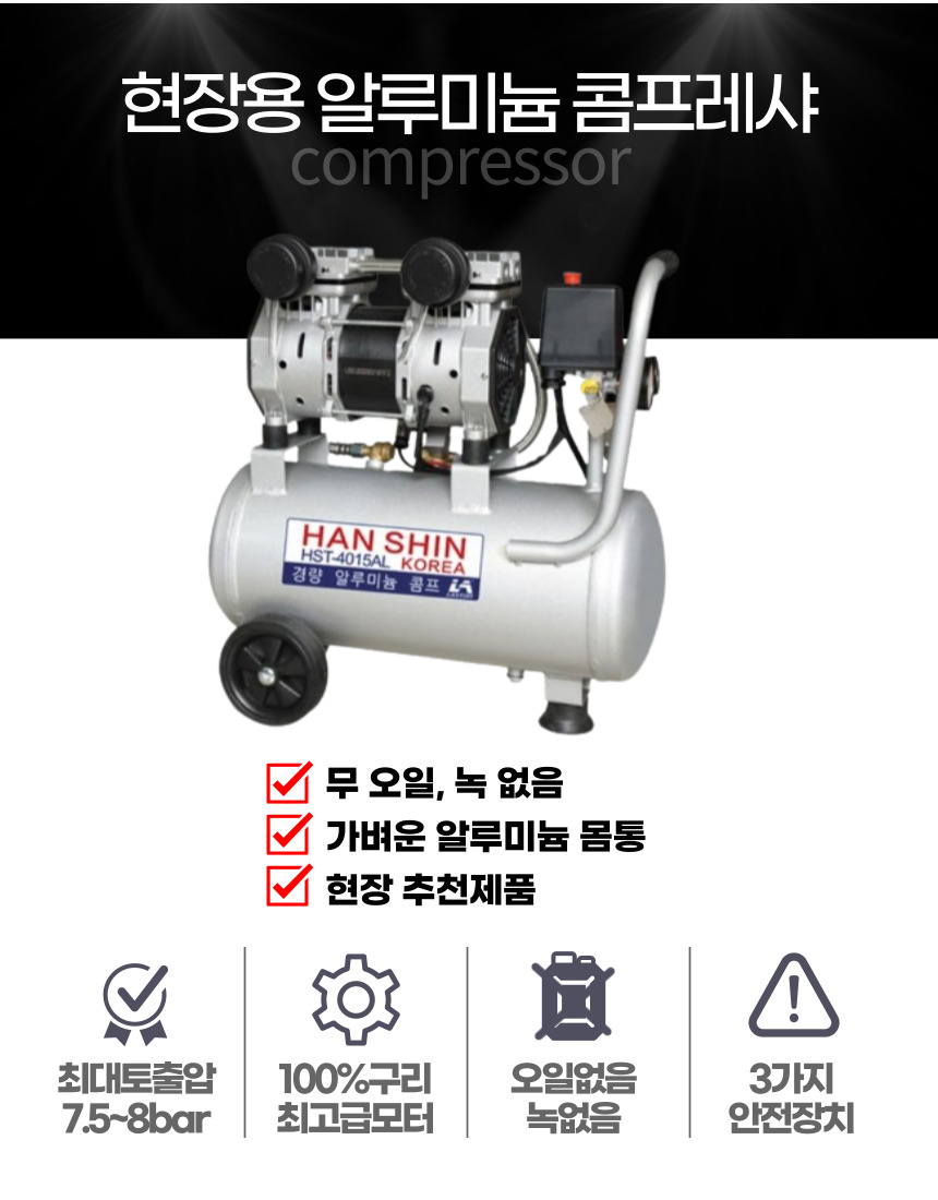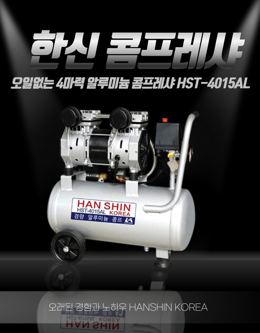 [한신]오일없는 알루미늄 콤프레샤 4.0마력 15L HST-4015AL(코일호스+에어건)